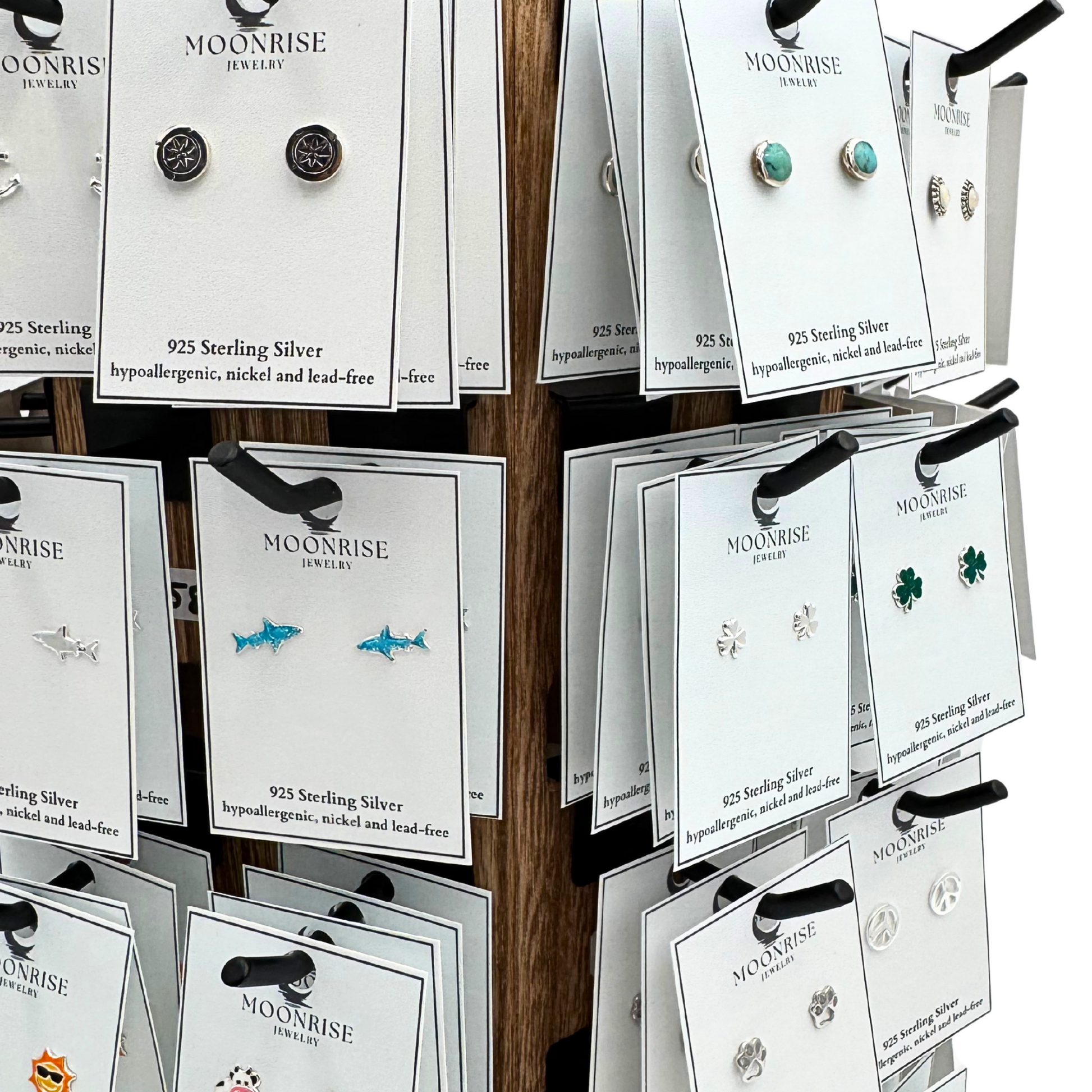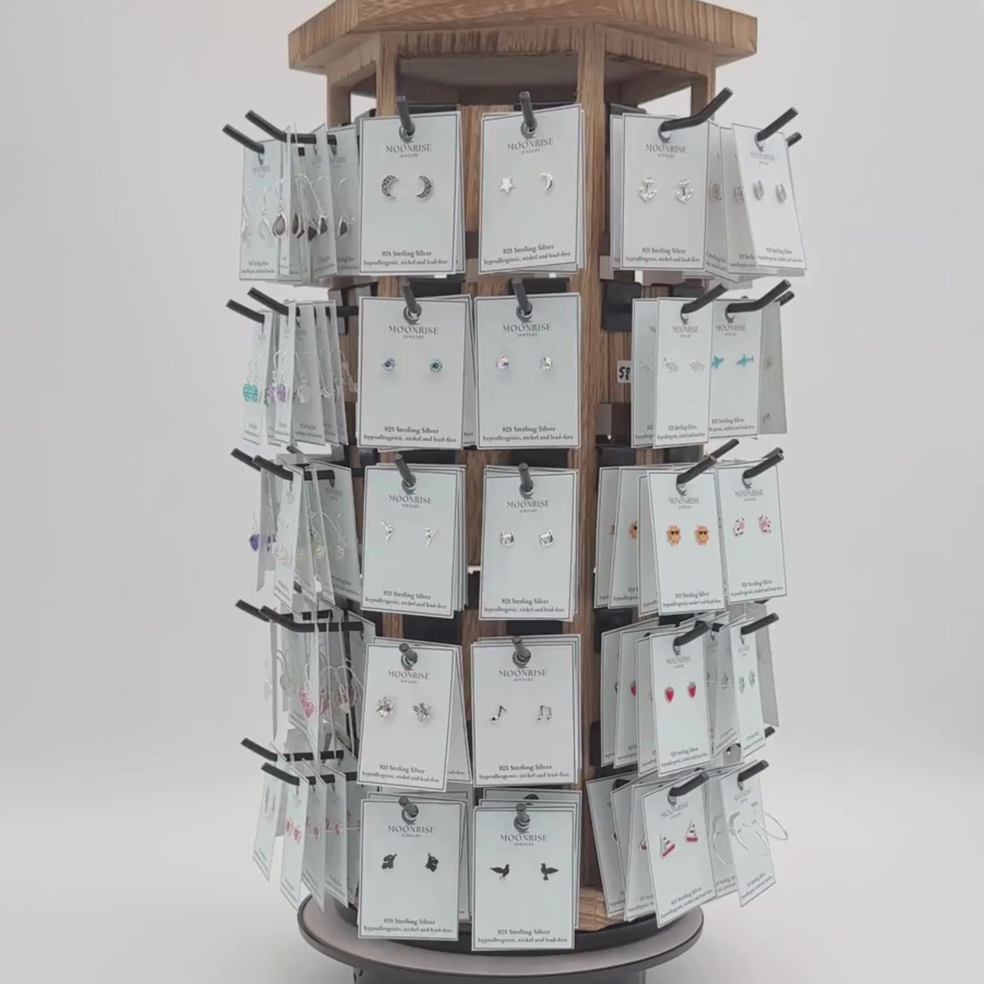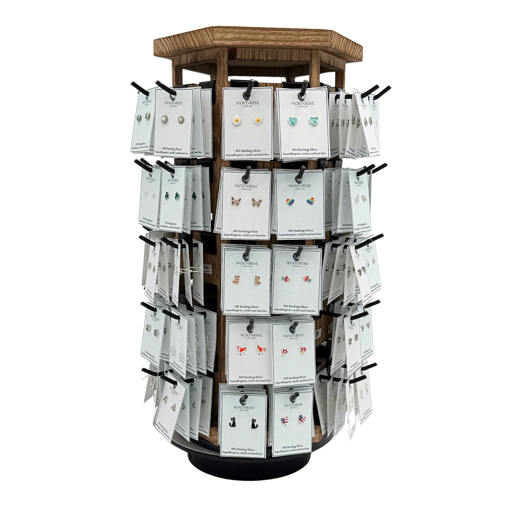 Holds 4 each of 60 different style earrings. Showcase many great designs without the worry of constant restocking. We have redesigned a smaller earring card with a top hole which eliminates the need for plastic lip backings.